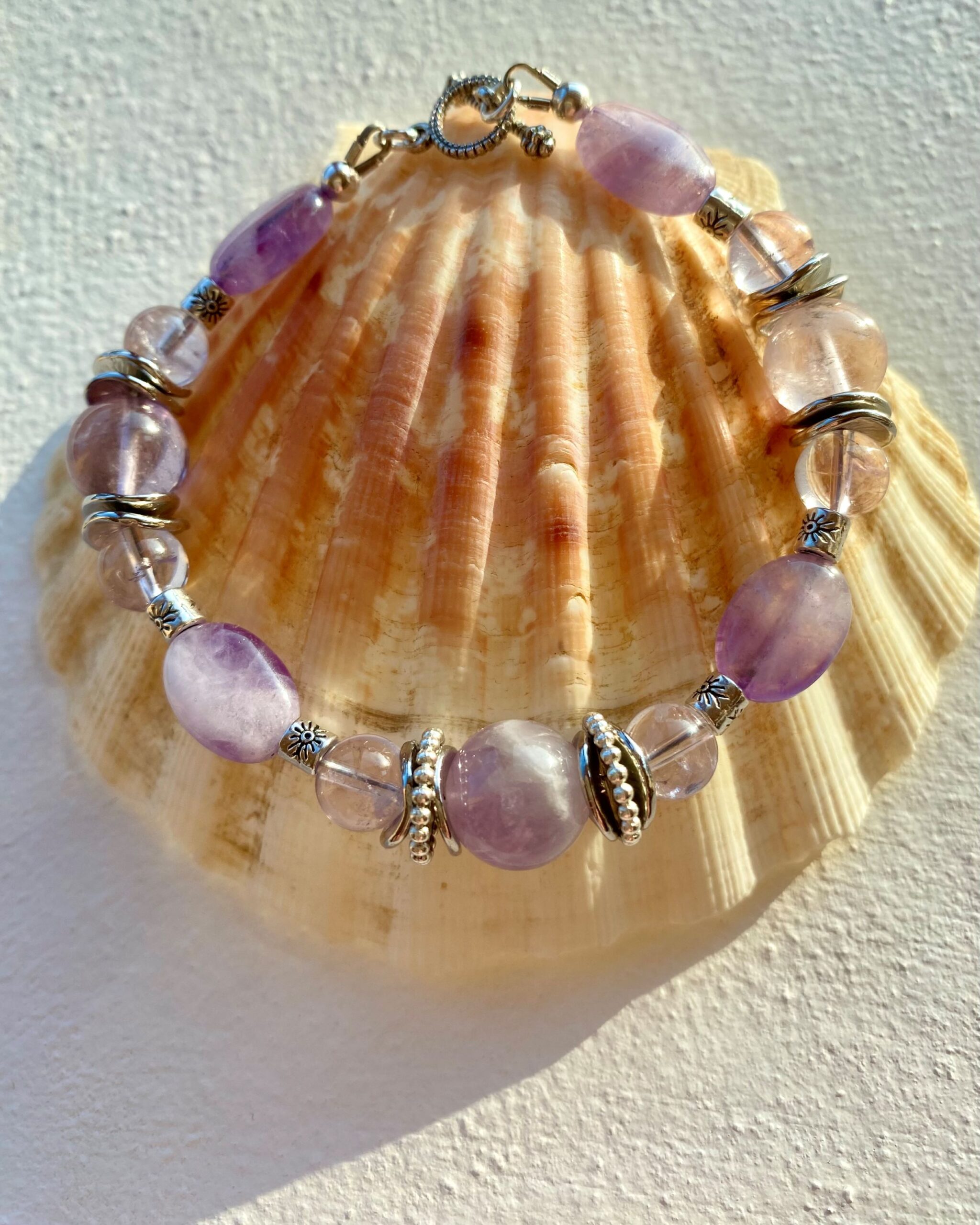 Naturaalsest ametüstist erikujuliste helmeste ja antiikhõbedast vahehelmestega T-kinnisega suletav käevõru.