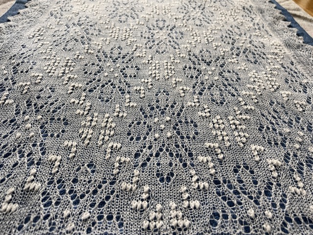 Õrn ja õhuline valge piduliku lillekirjaga Haapsalu sall.