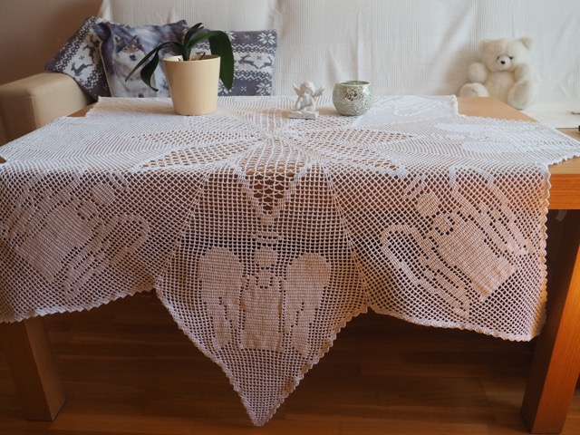See käsitsi heegeldatud valge inglimustriga laudlina loob jõulude ajal tõeliselt hubase ja pühaliku meeleolu. Käsitöö peenus ja valge toon loovad tunde, nagu oleks kogu ruum rahu ja soojust täis.