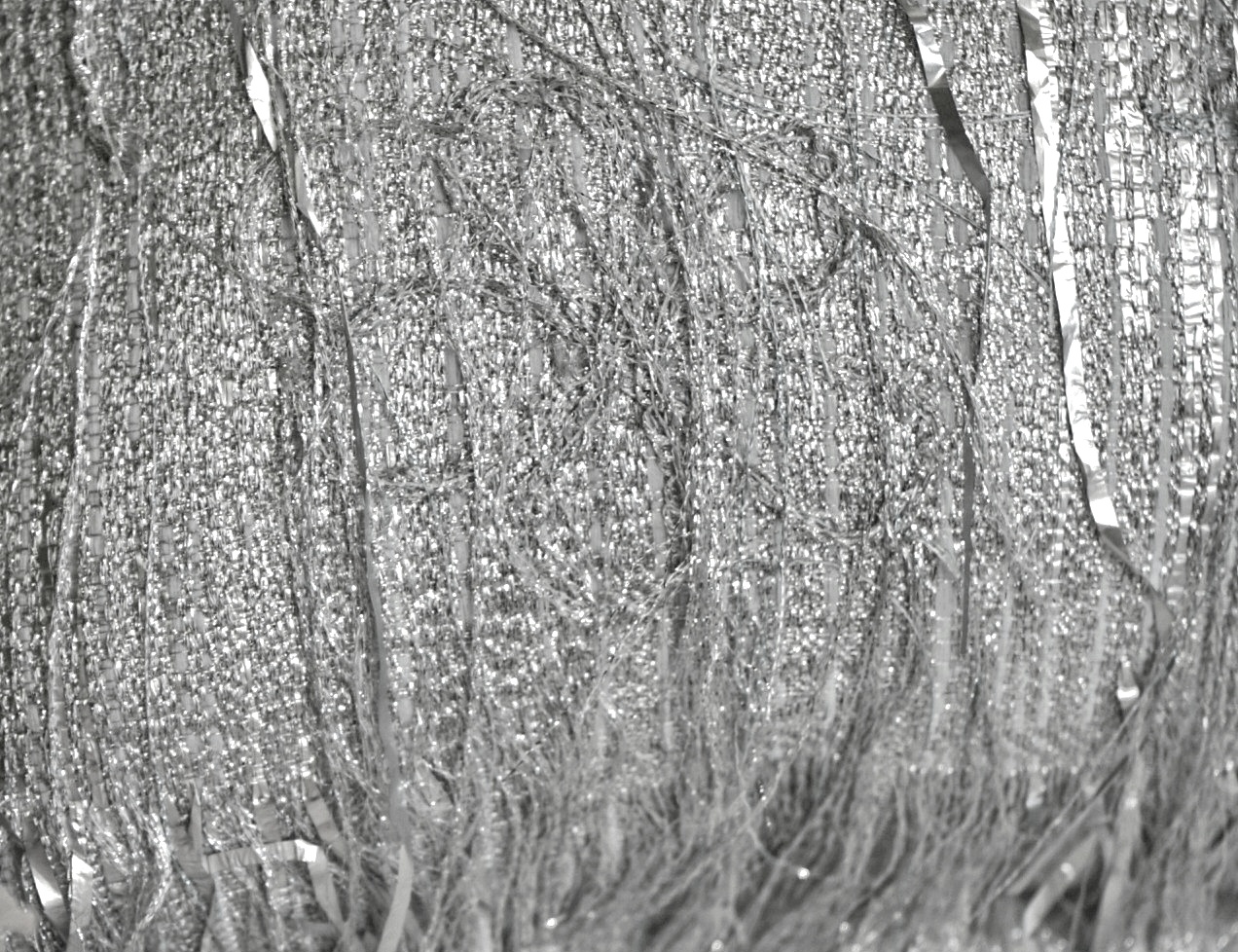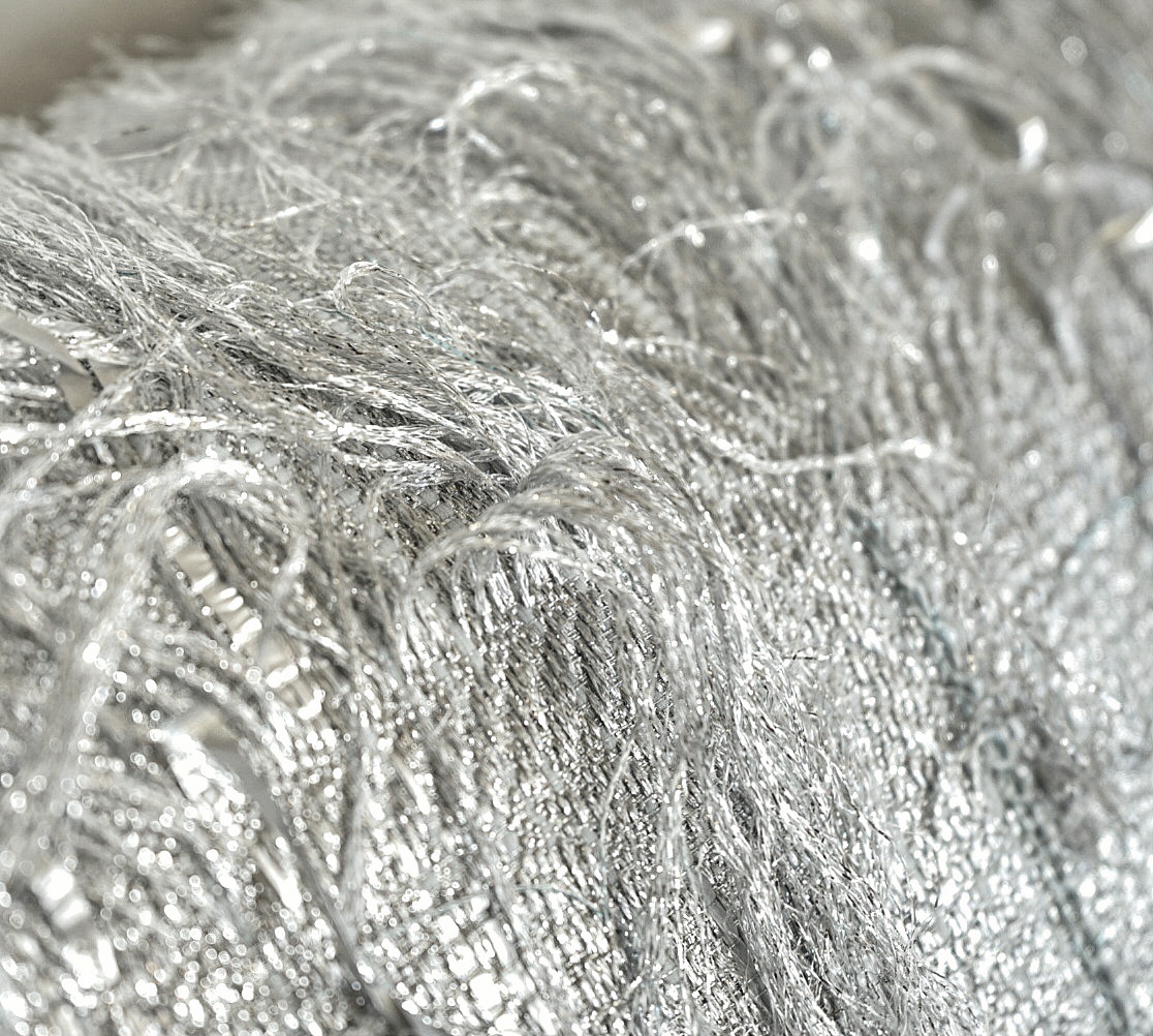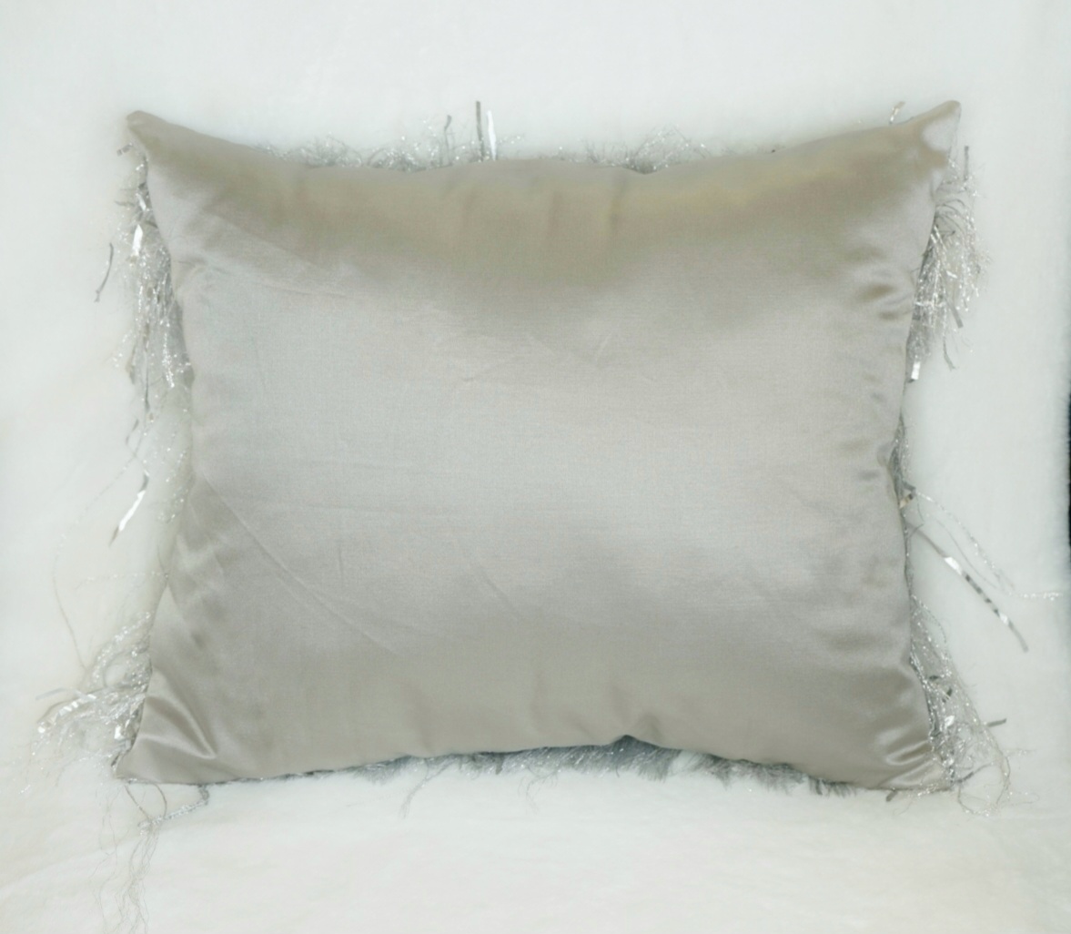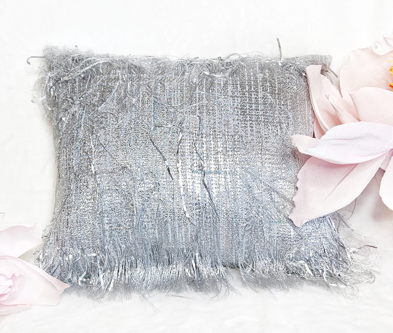 Hõbemetallik kanga ja narmastega diivanipadi. Toodet valmis ainult üks. Diivanipadi tuleb koos eemaldatava sisupadjaga.