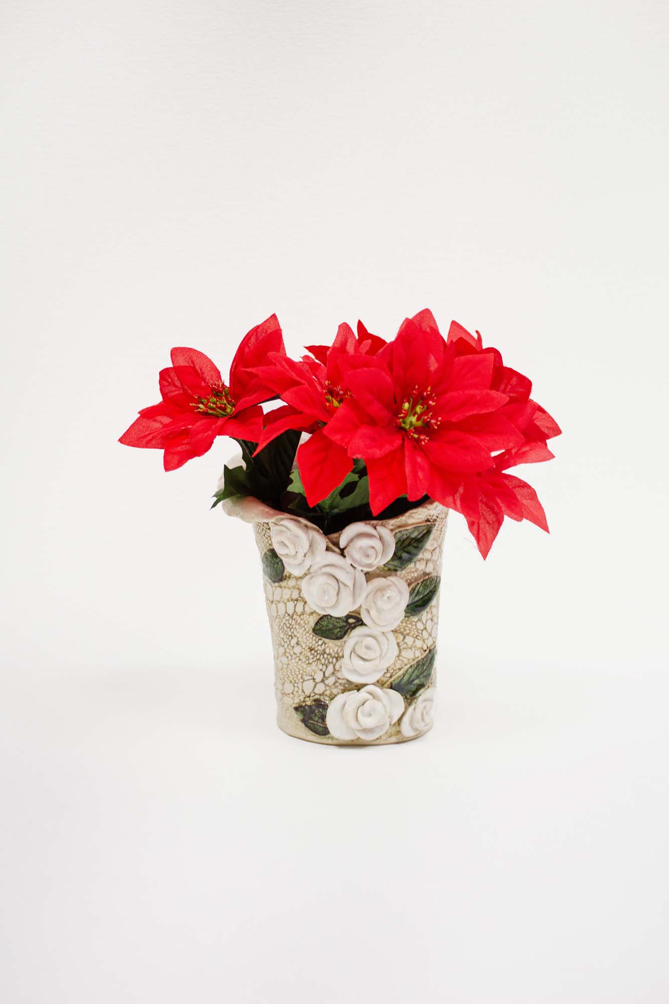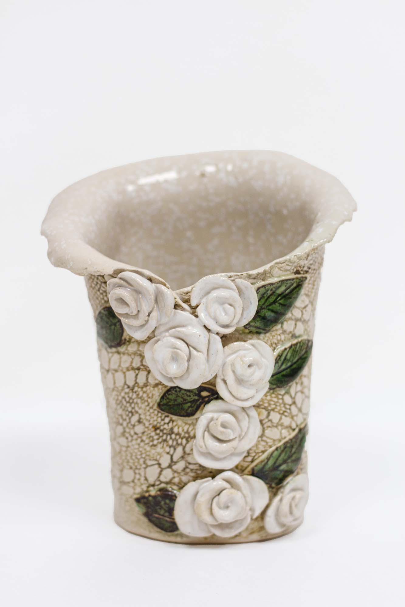 Vaas on valmistatud käsitööna. Värvus on naturaalne, roosid on valget värvi.