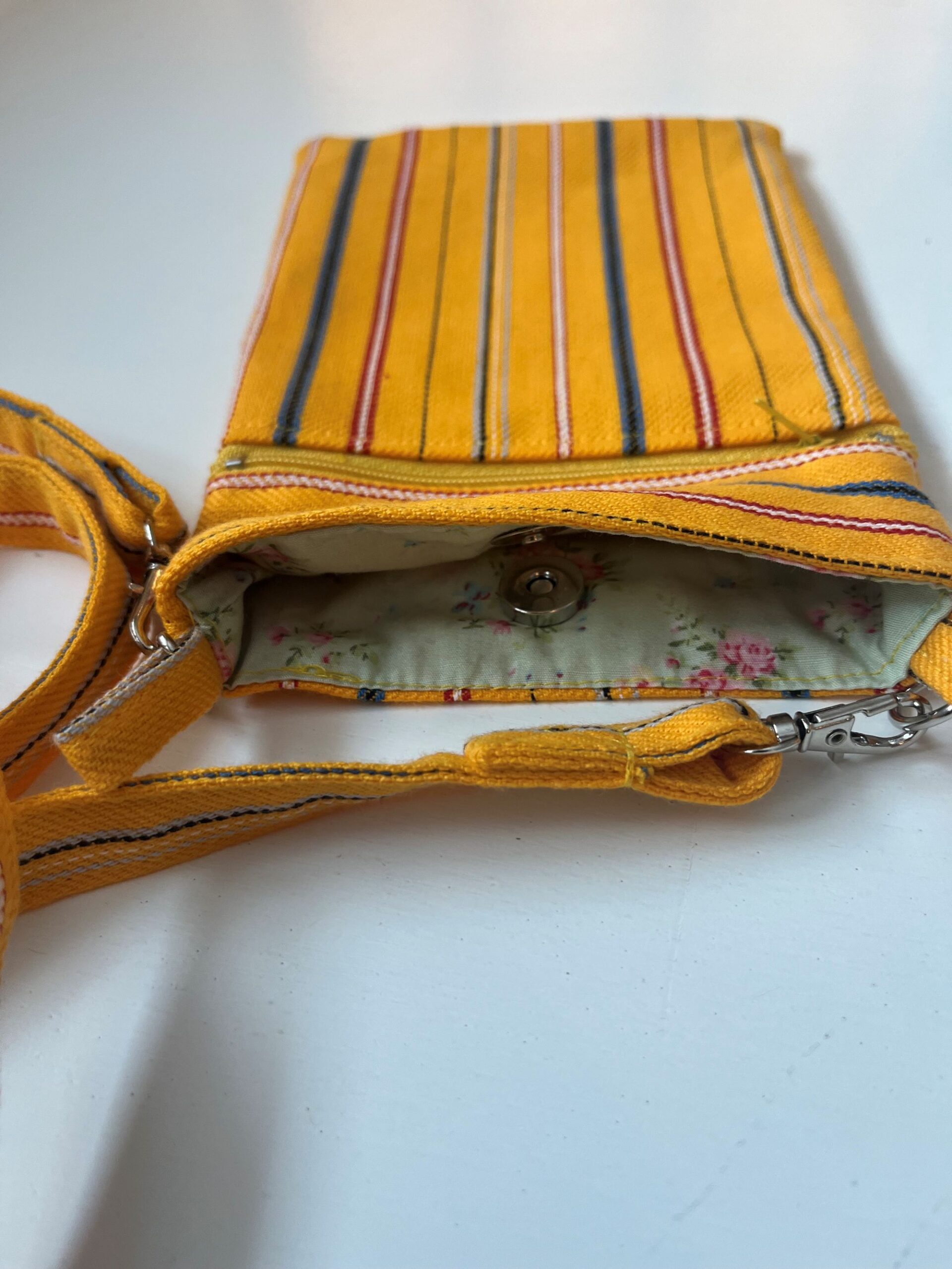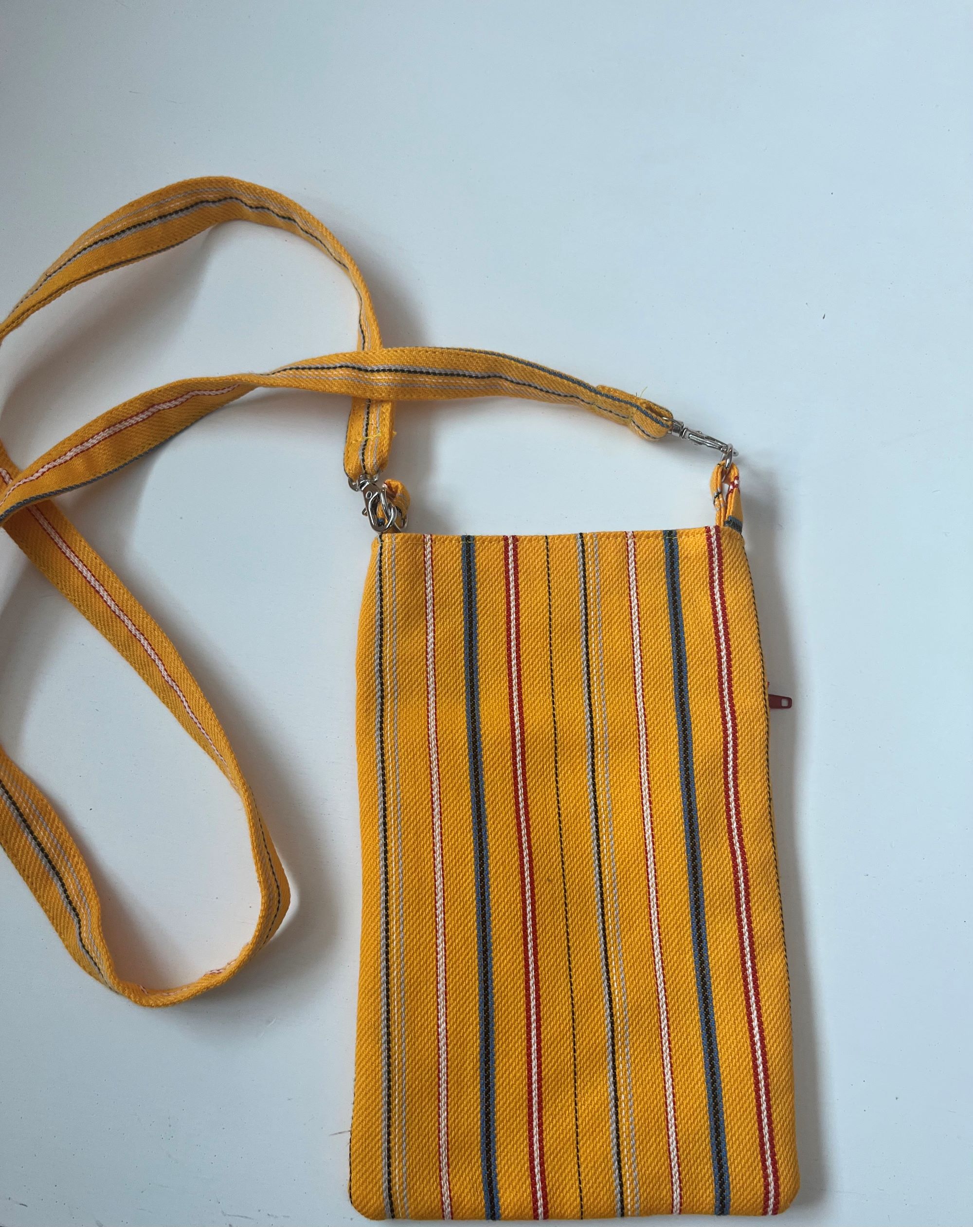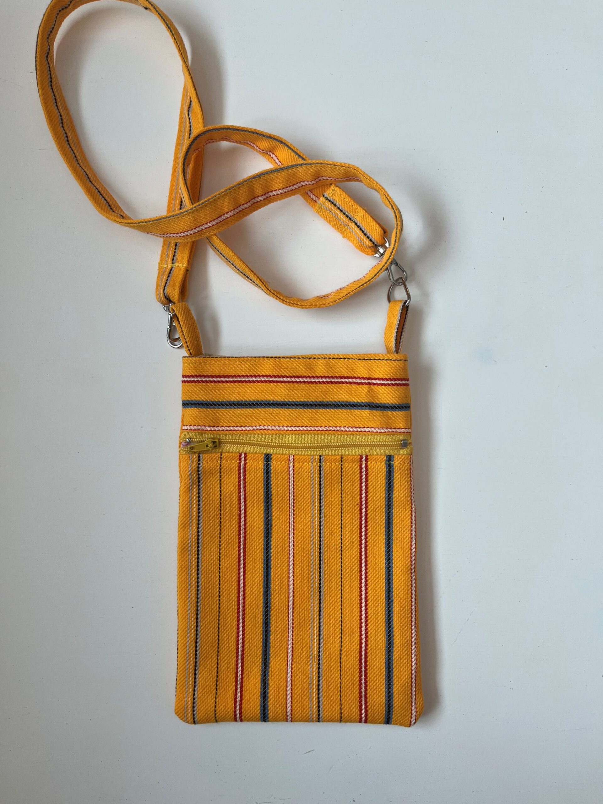 Muhu triibumustriga kangast õmmeldud õlakott. Koti suurus 20 x 14 cm. Koti ees on lukuga tasku. kotti saab sulgeda magnetsulguriga. Õlapaela pikkus on 90 cm.