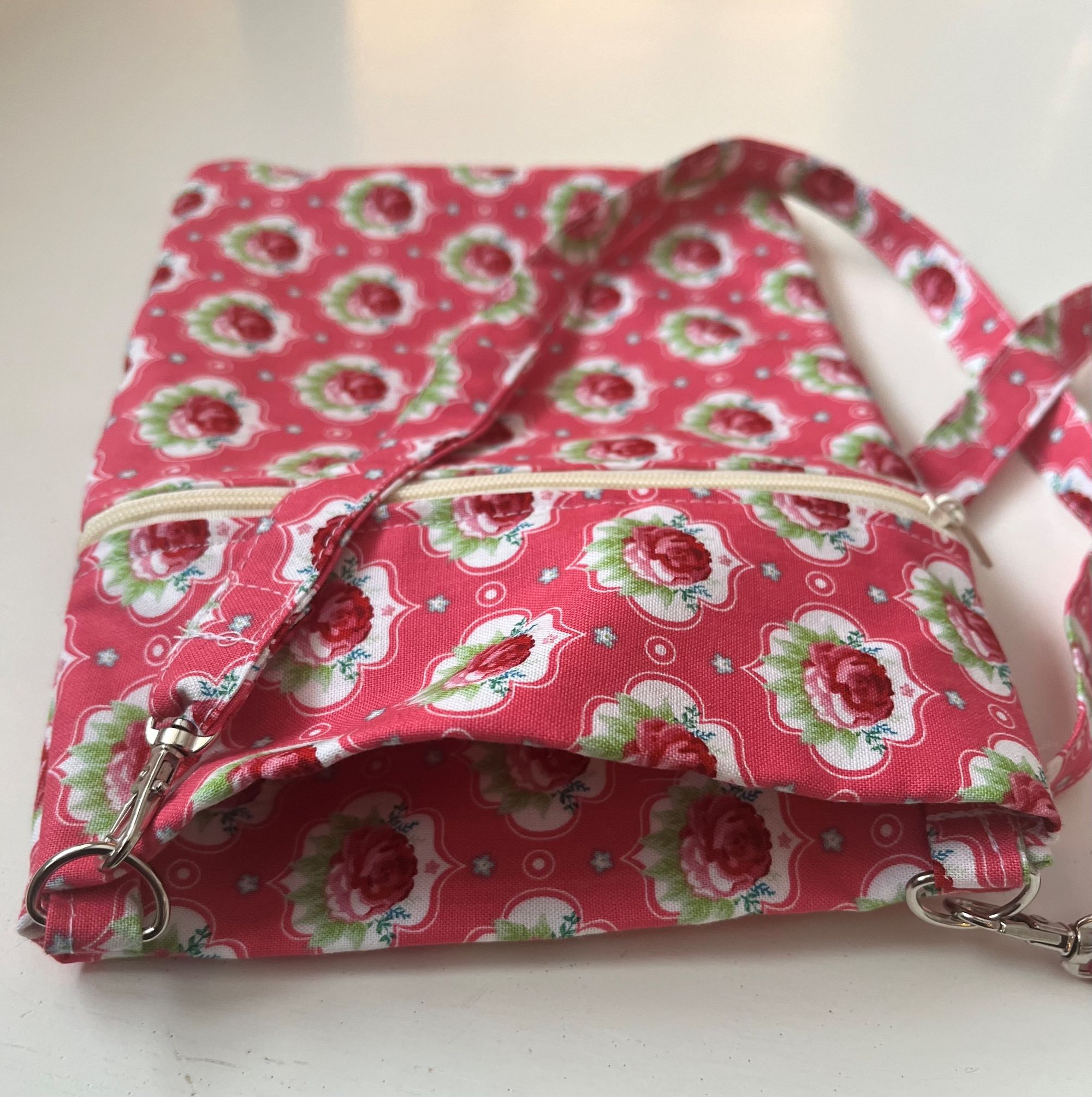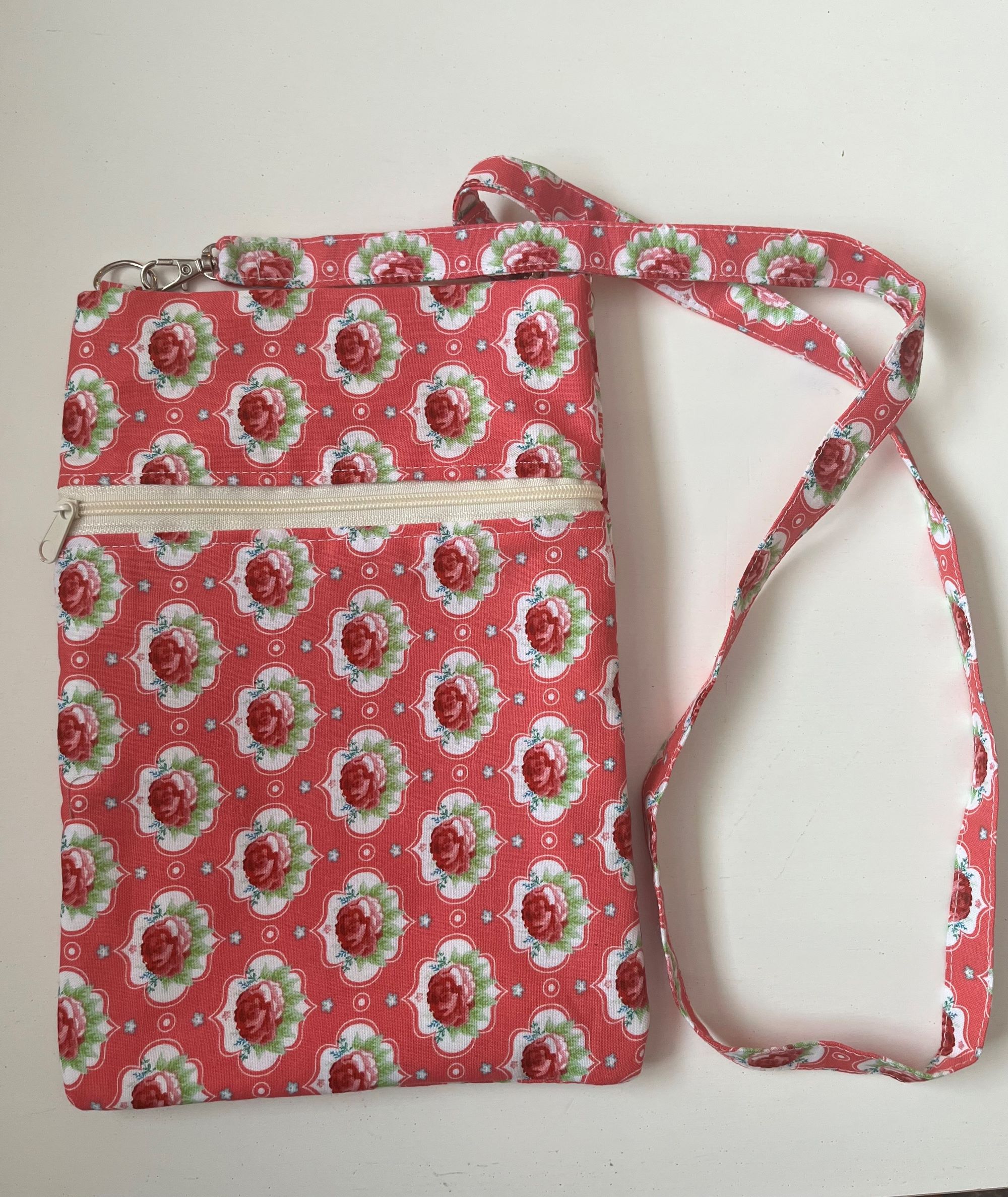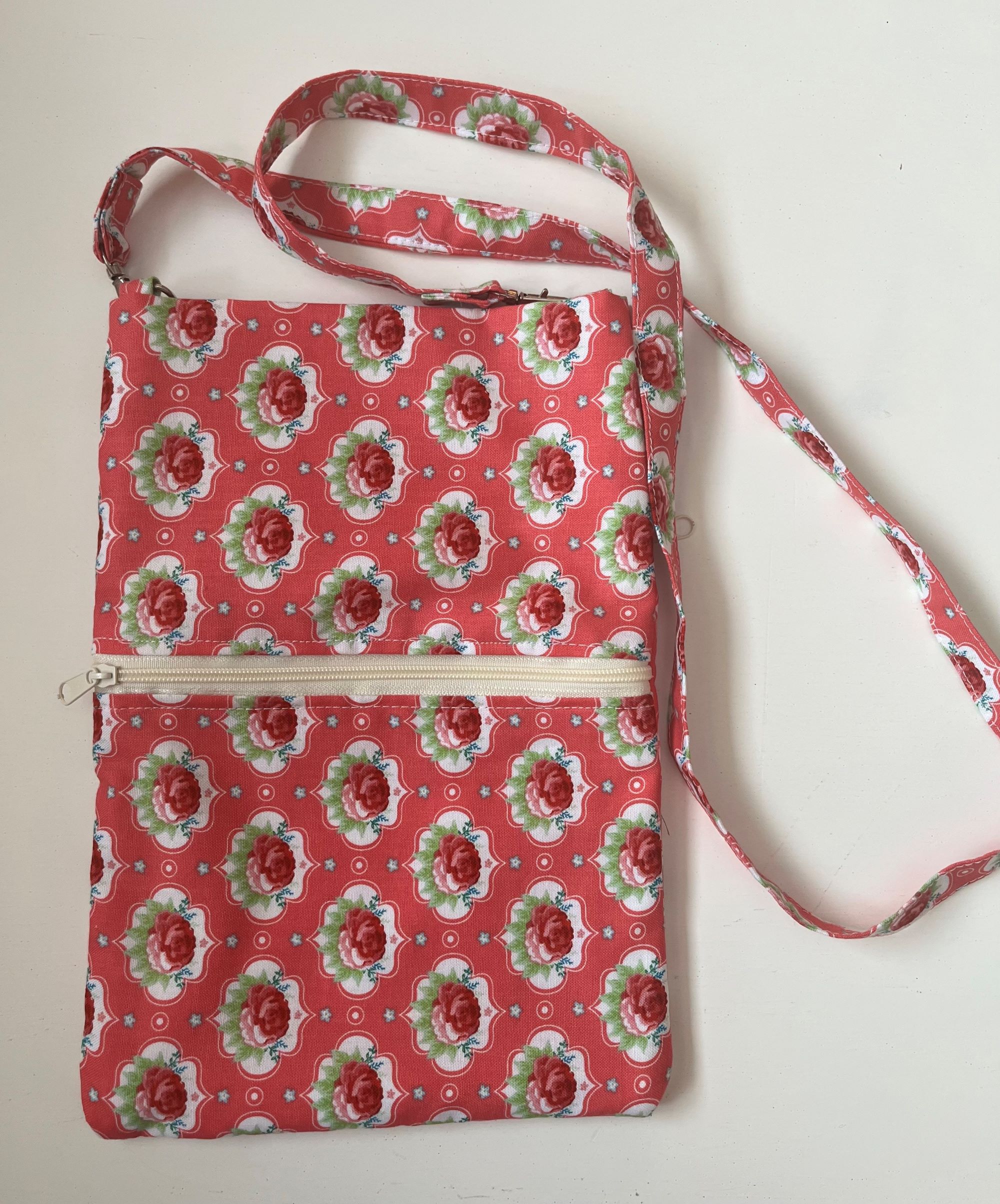 Väike õlakott kahe lukuga. Kott on õmmeldud puuvillasest kangast. Koti kõrgus on 25 cm ja laius 17 cm. Õlapaela pikkus on 50 cm.