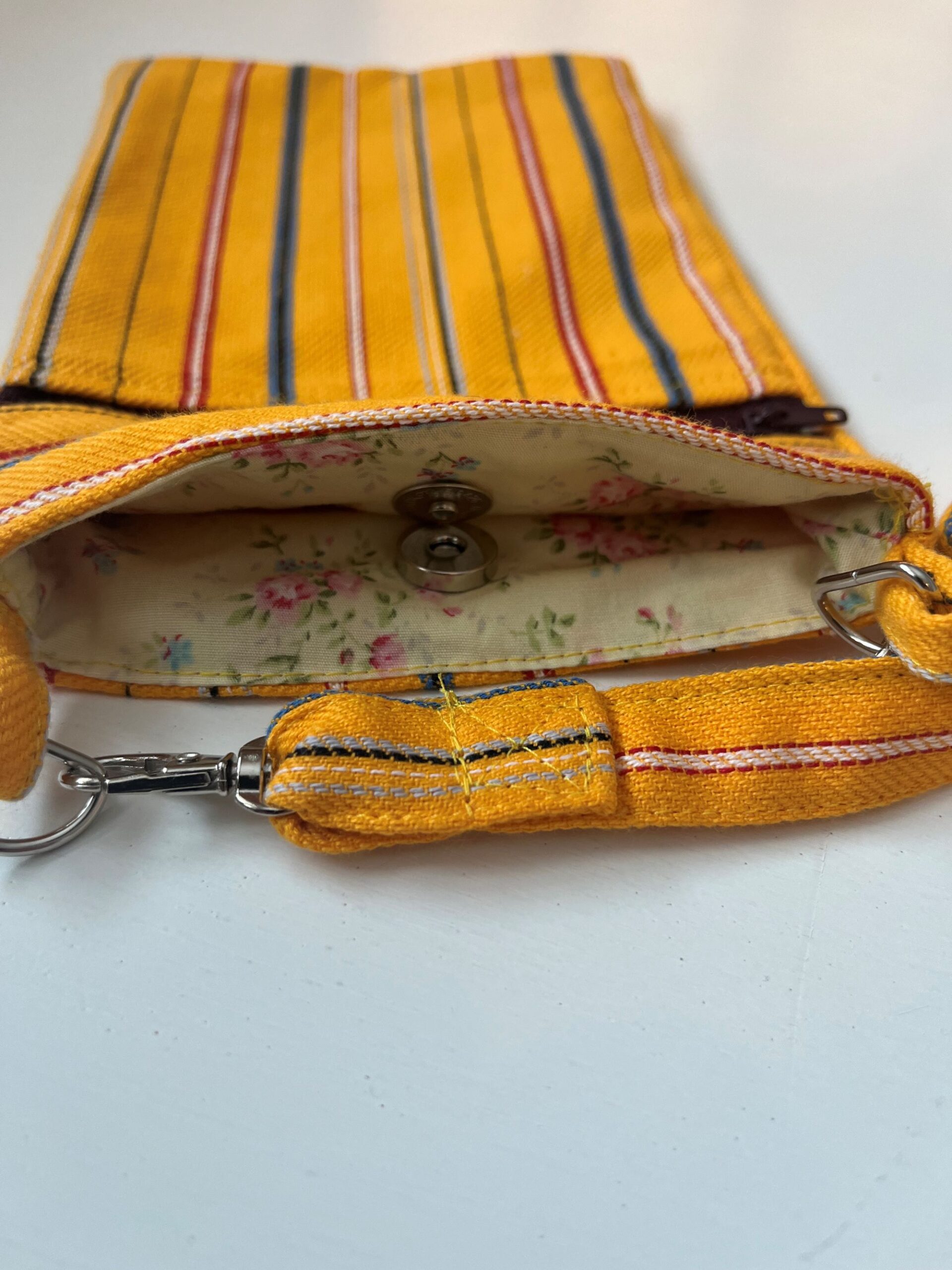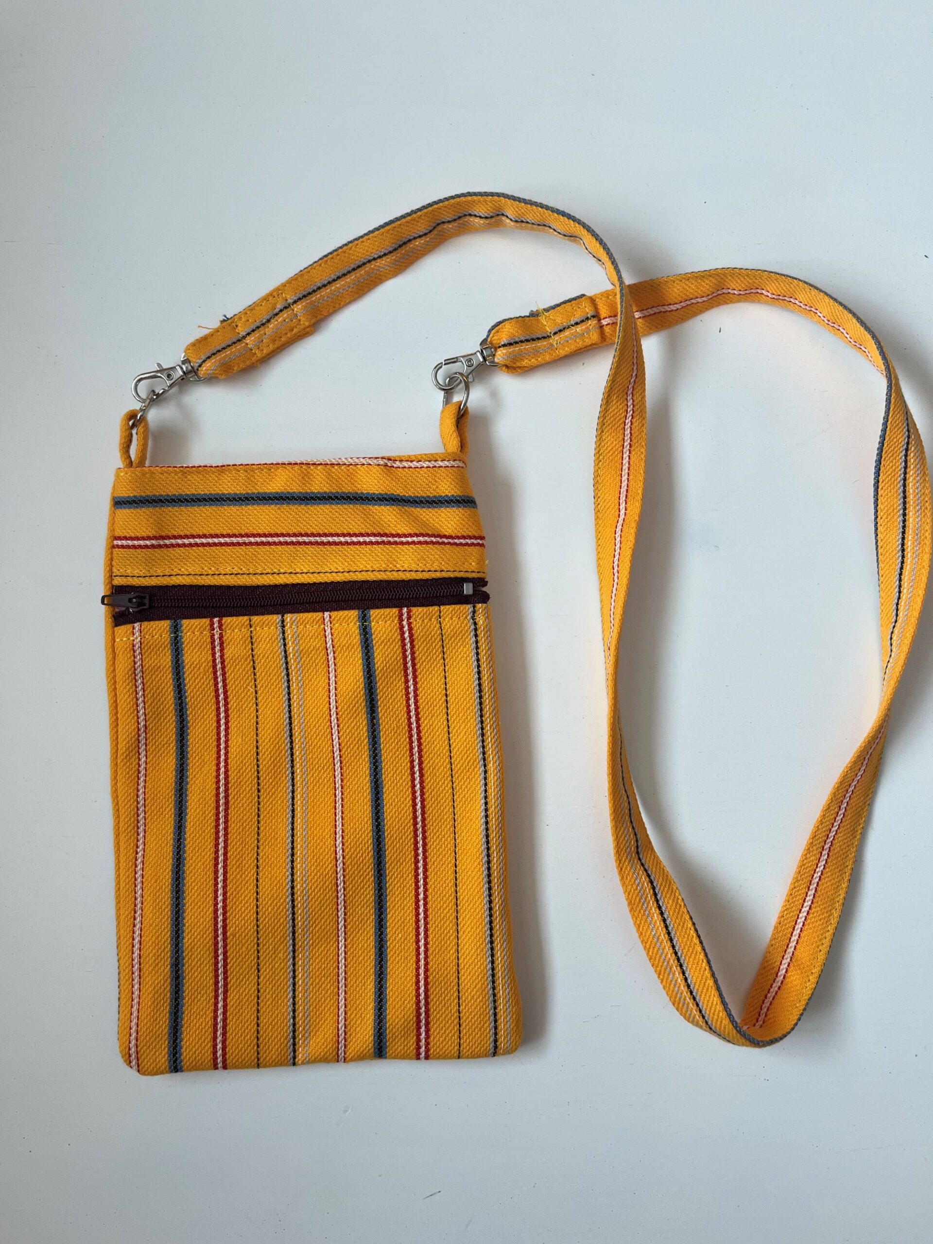 Muhu triibumustriga kangast õmmeldud õlakott. Koti suurus 20 x 14 cm. Koti ees on lukuga tasku. kotti saab sulgeda magnetsulguriga. Õlapaela pikkus on 90 cm.