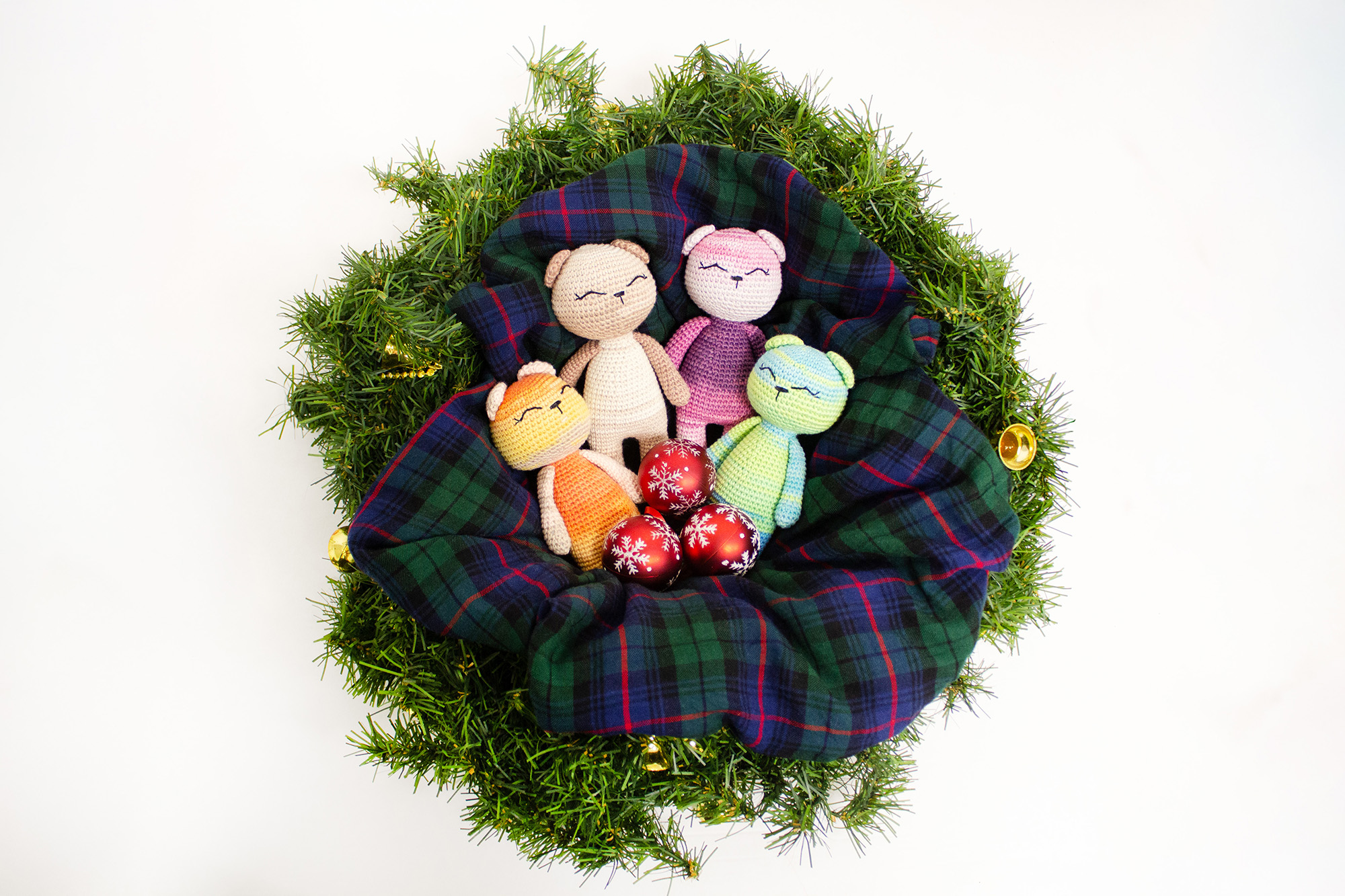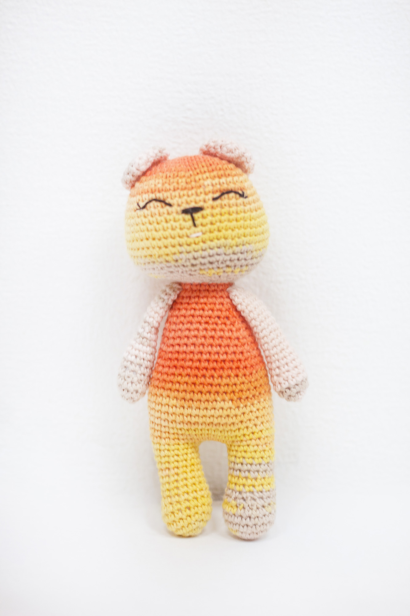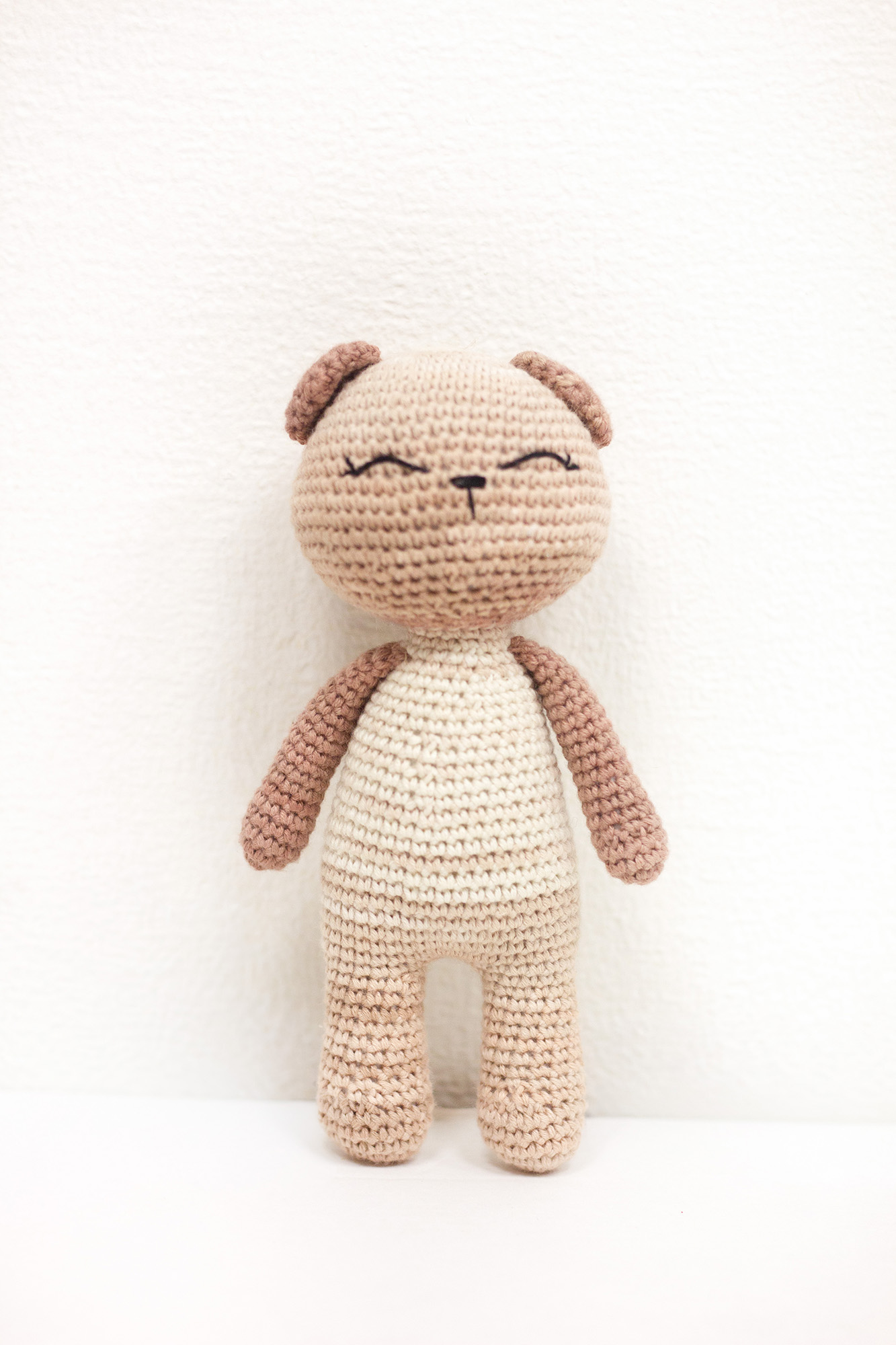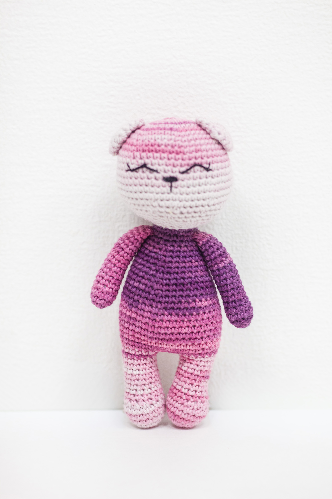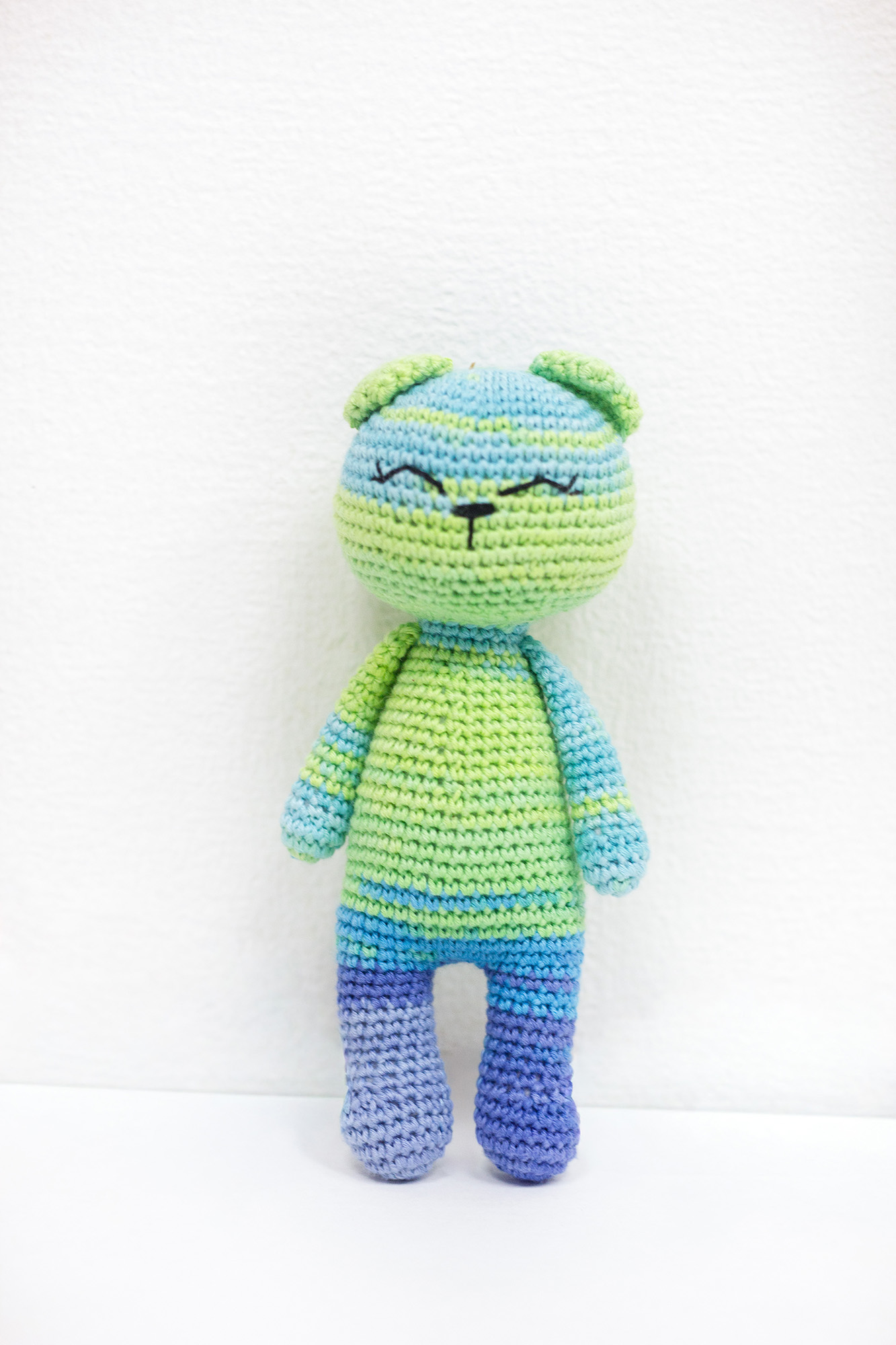 Heegeldatud puuvillasest lõngast ja täiteks kasutatud kerakiusid. Mõmmi pikkus 17 cm ja laius 8 cm.