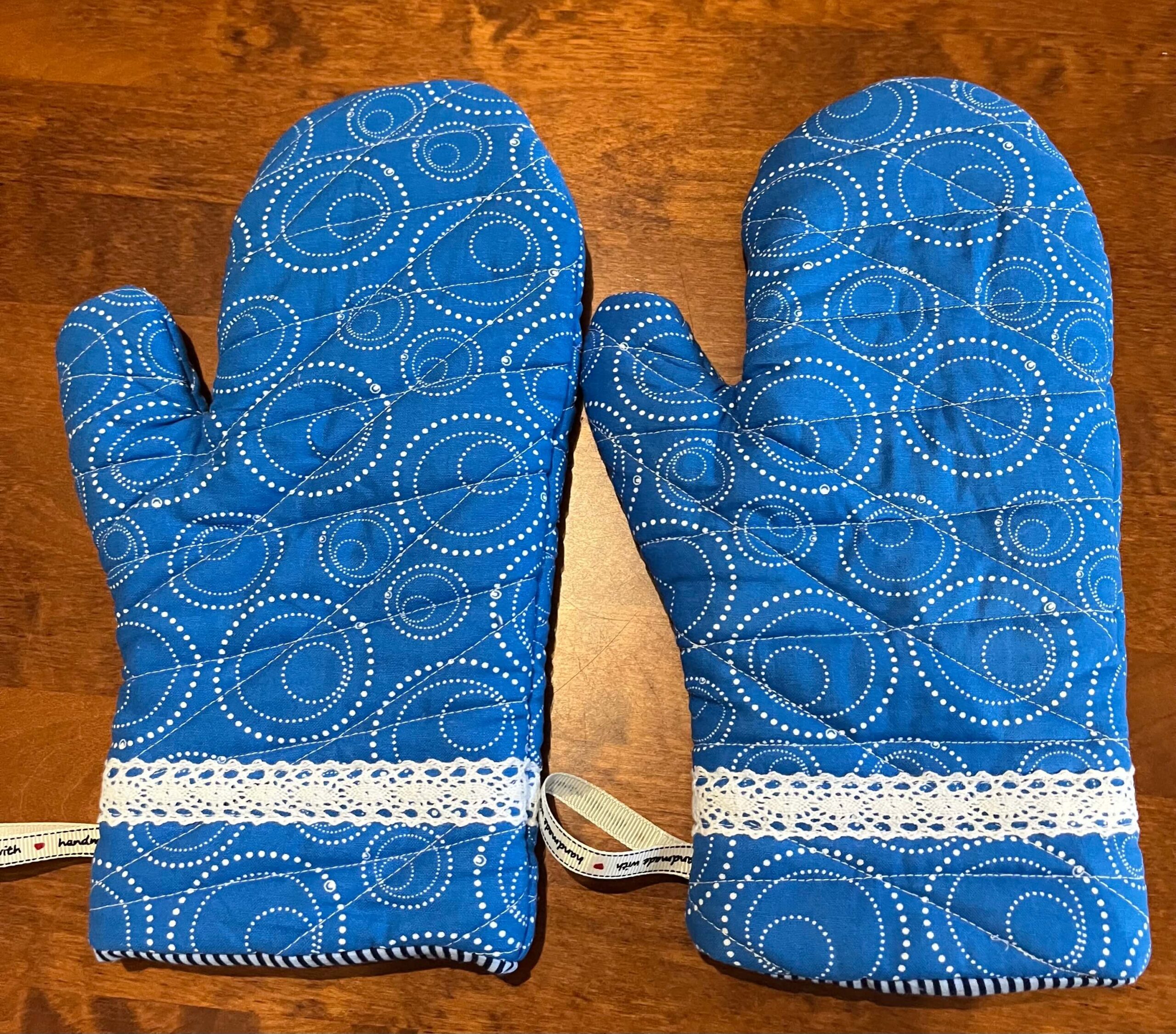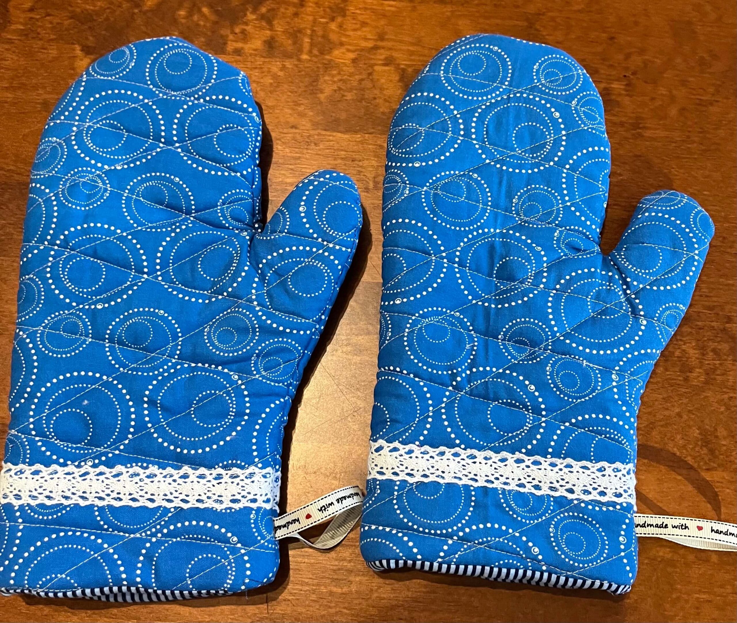 Puuvillasest riidest käsitööna valminud pajakindad. Sees on kahekordne vatiin. Kindaid saab pesta 40 c juures.