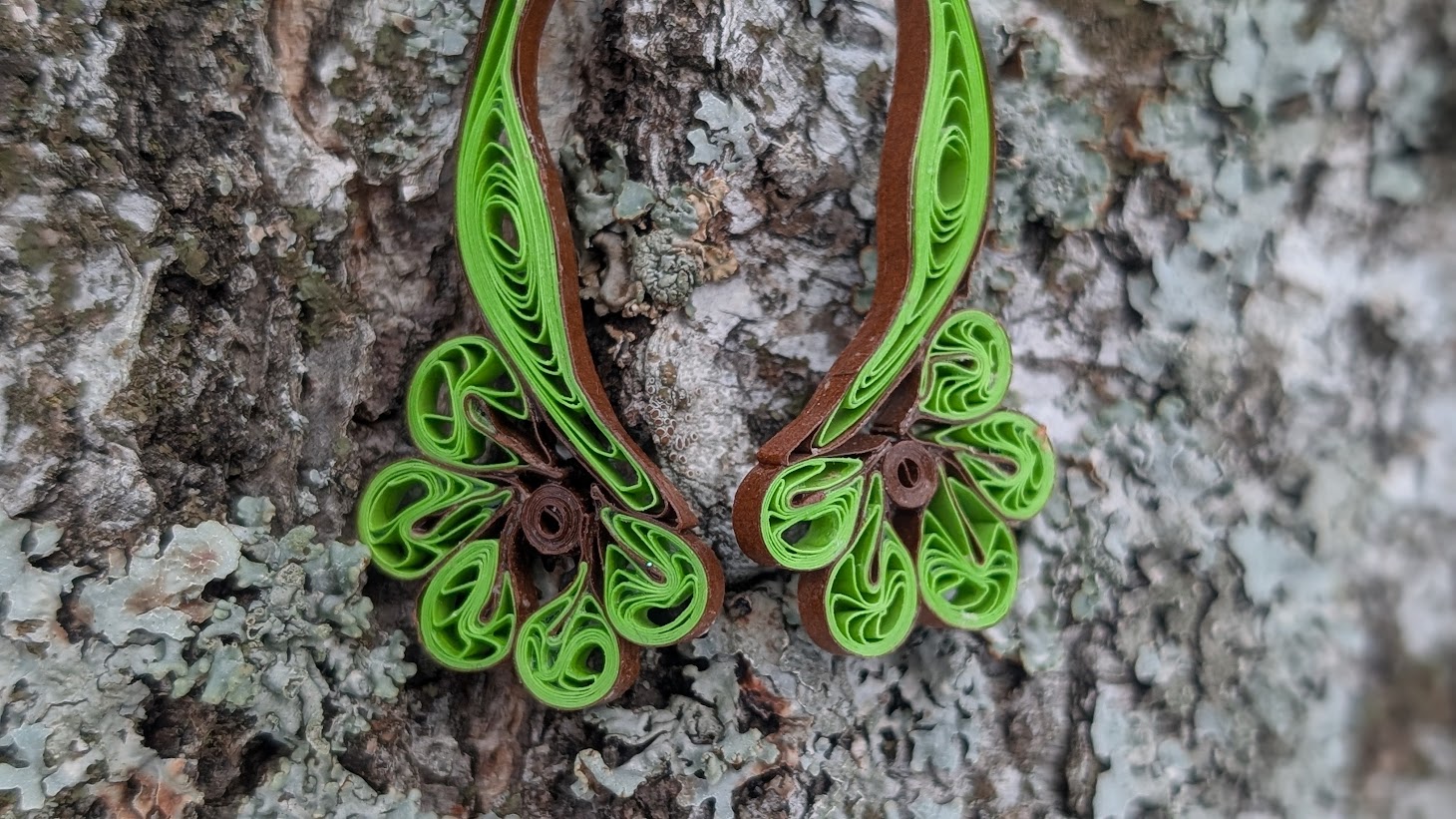 Täielikult käsitööna minu enda tehtud paberist looming. Quilling tehnikas valmistatud. St et pabeririba on kokku rullitud, sellele on šablooni abil kuju antud ja siis kokku liimitud. Nad on imeliselt kerged! Kaaluvad kõigest mõni gramm ja katsudes on nad tugevad.