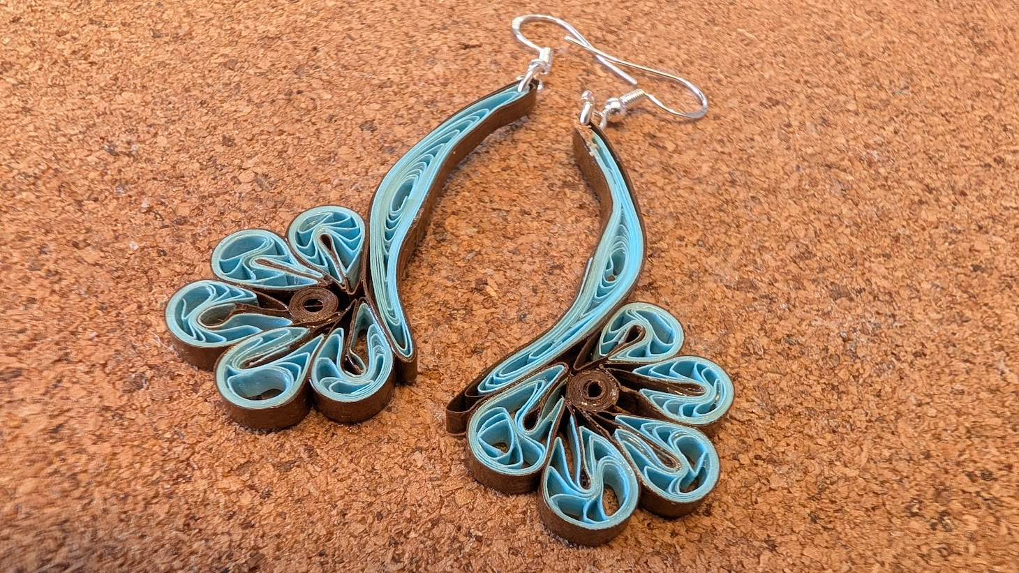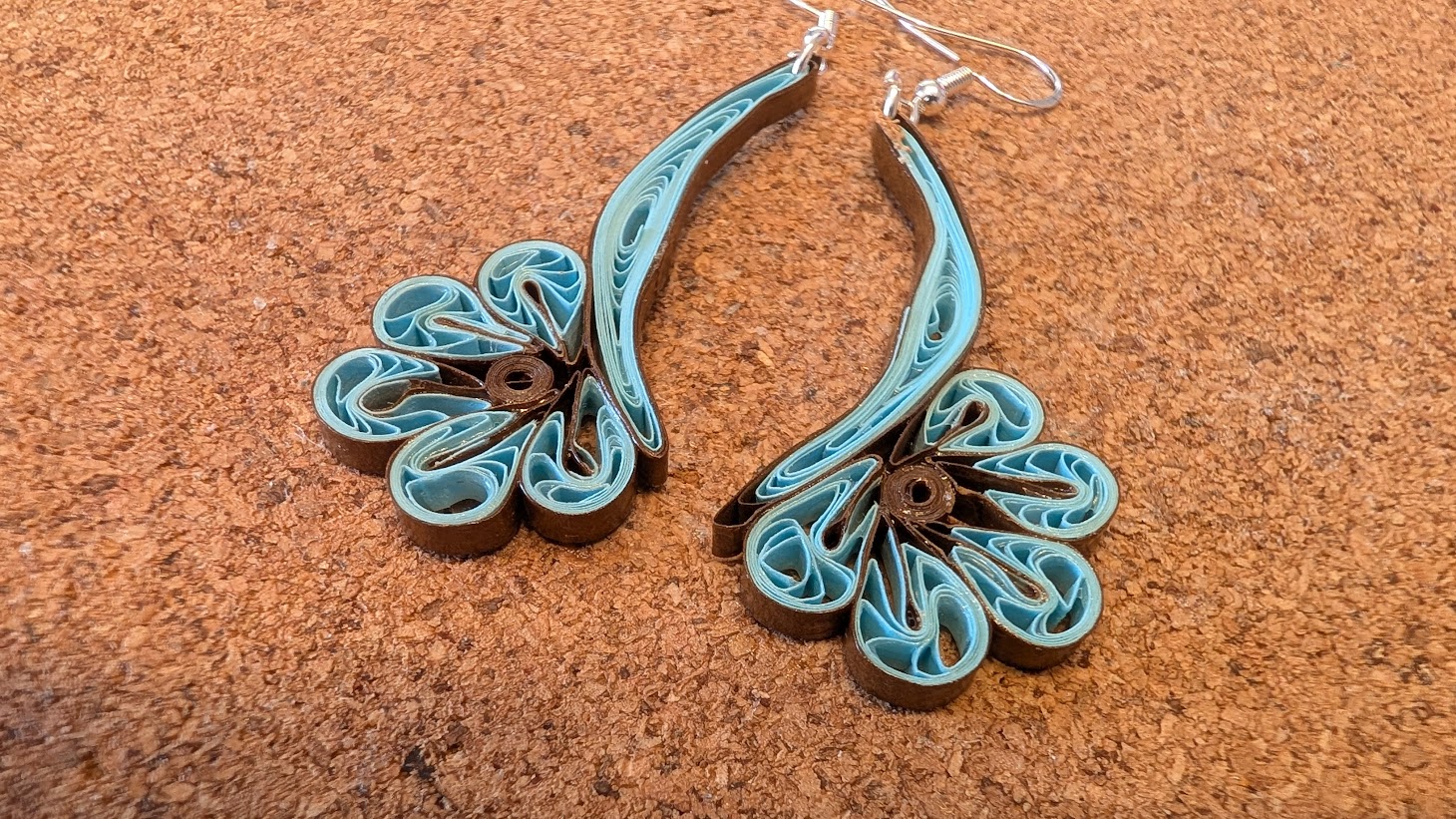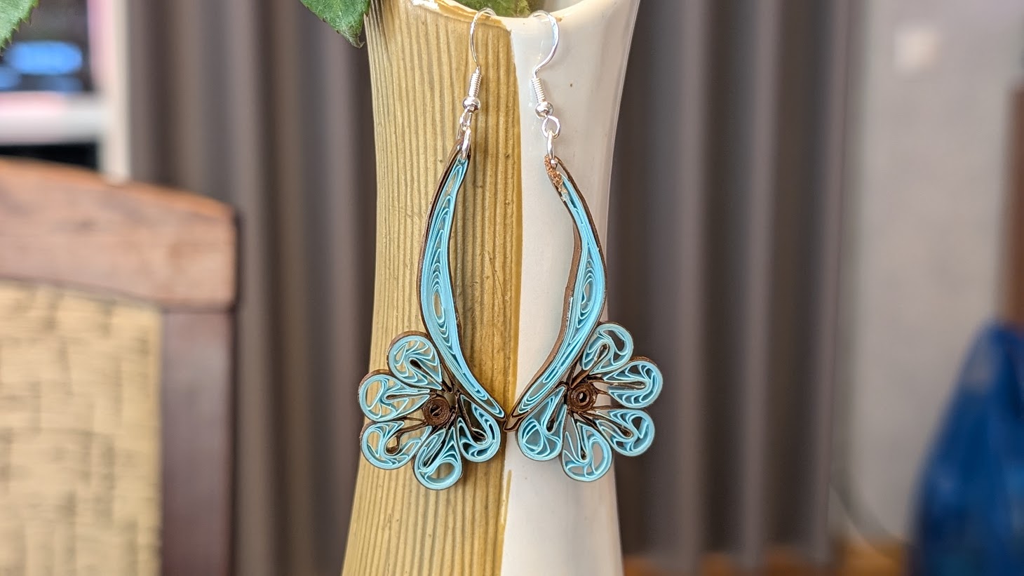 Täielikult käsitööna minu enda tehtud paberist looming. Quilling tehnikas valmistatud. St et pabeririba on kokku rullitud, sellele on šablooni abil kuju antud ja siis kokku liimitud. Nad on imeliselt kerged! Kaaluvad kõigest mõni gramm ja katsudes on nad tugevad.