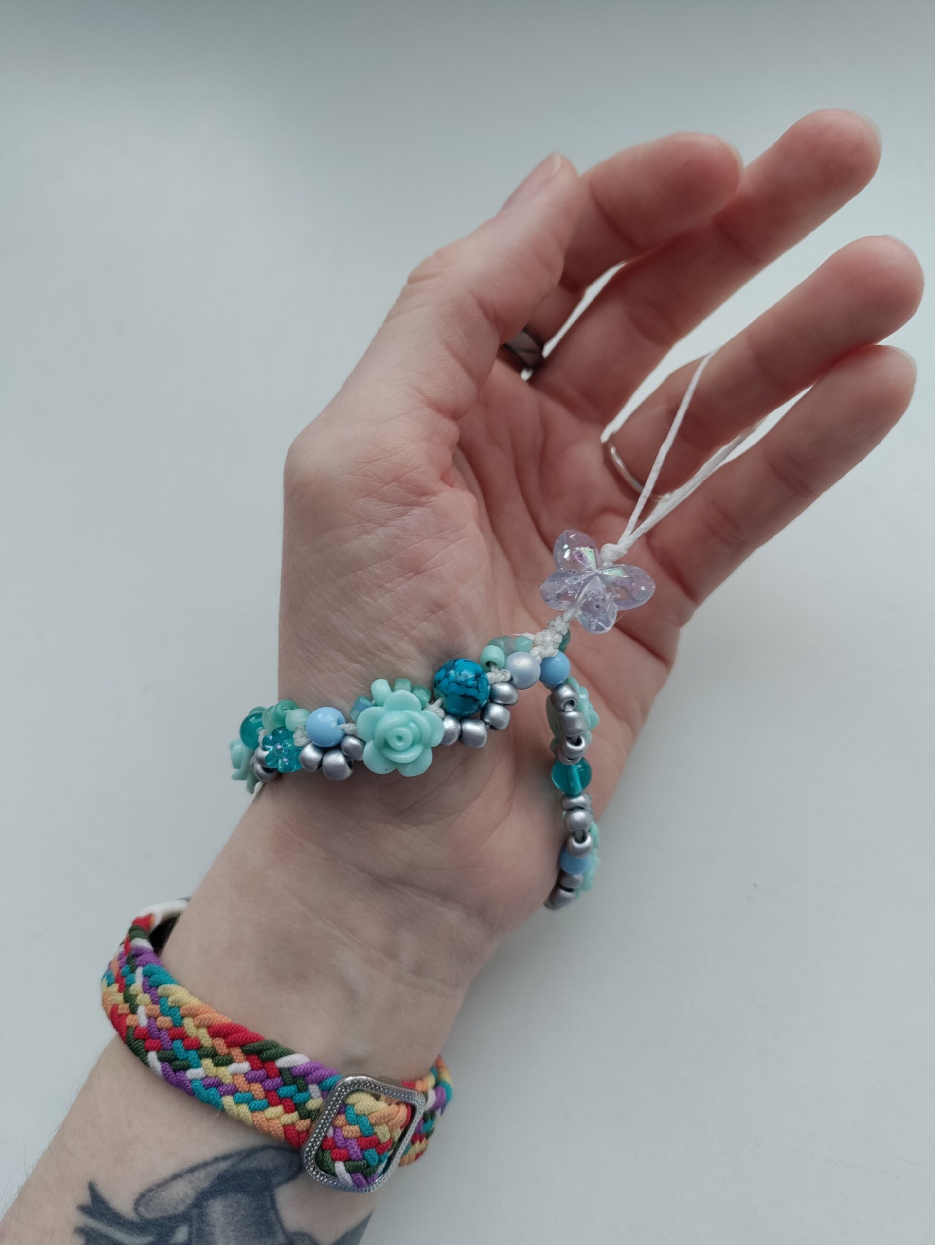 Käsitööna punutud telefoni pael. Valmistatud vahatatud rätsepanöörist, paljude sõlmede ja erinevate materjalidega. Kasutatud erinevaid kvaliteetseid uuskasutatud materjale. Vastupidav, mõnus mudida, särtsakalt värviline.