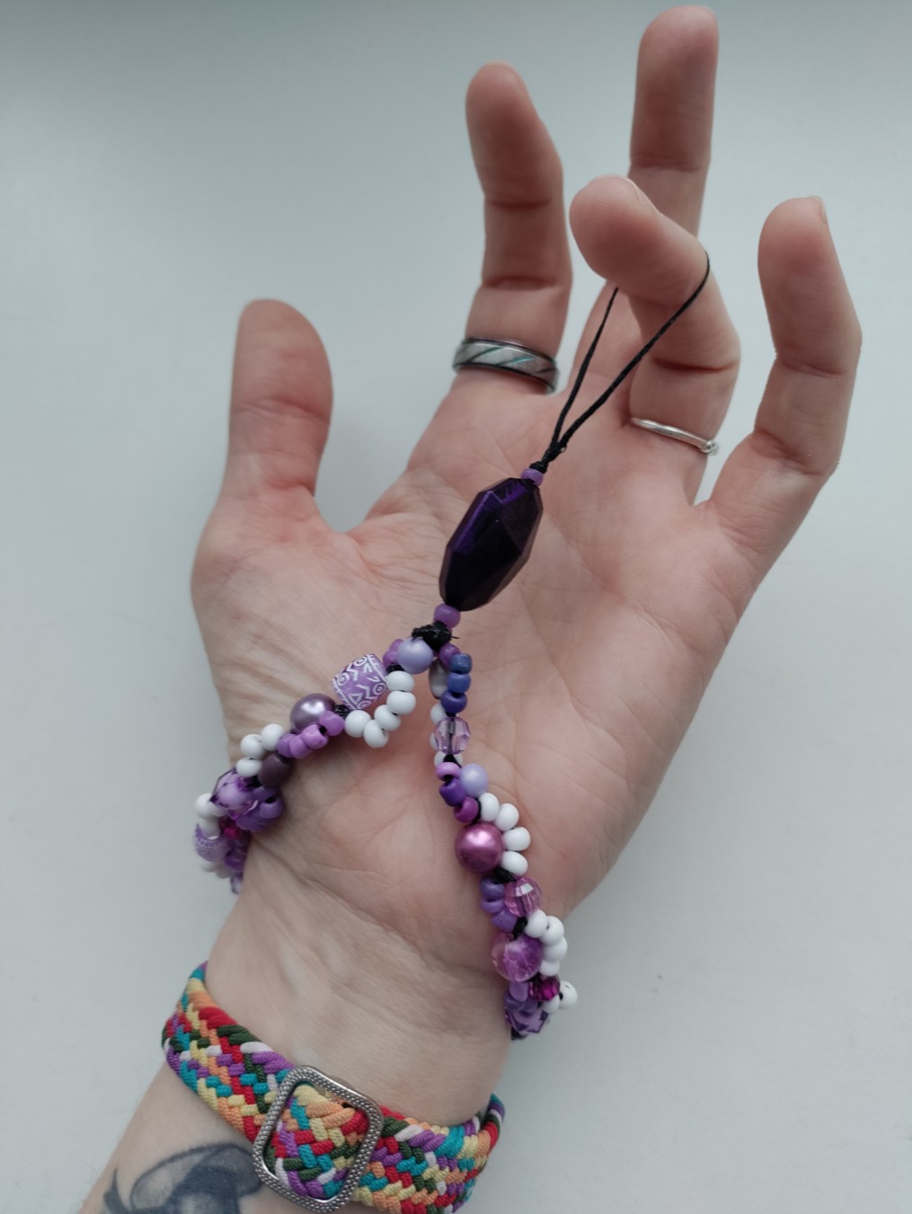 Käsitööna punutud telefoni pael. Valmistatud vahatatud rätsepanöörist, paljude sõlmede ja erinevate materjalidega. Kasutatud erinevaid kvaliteetseid uuskasutatud materjale. Vastupidav, mõnus mudida, särtsakalt värviline.