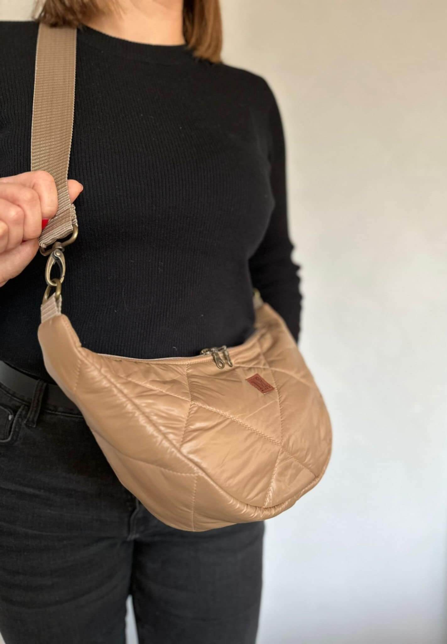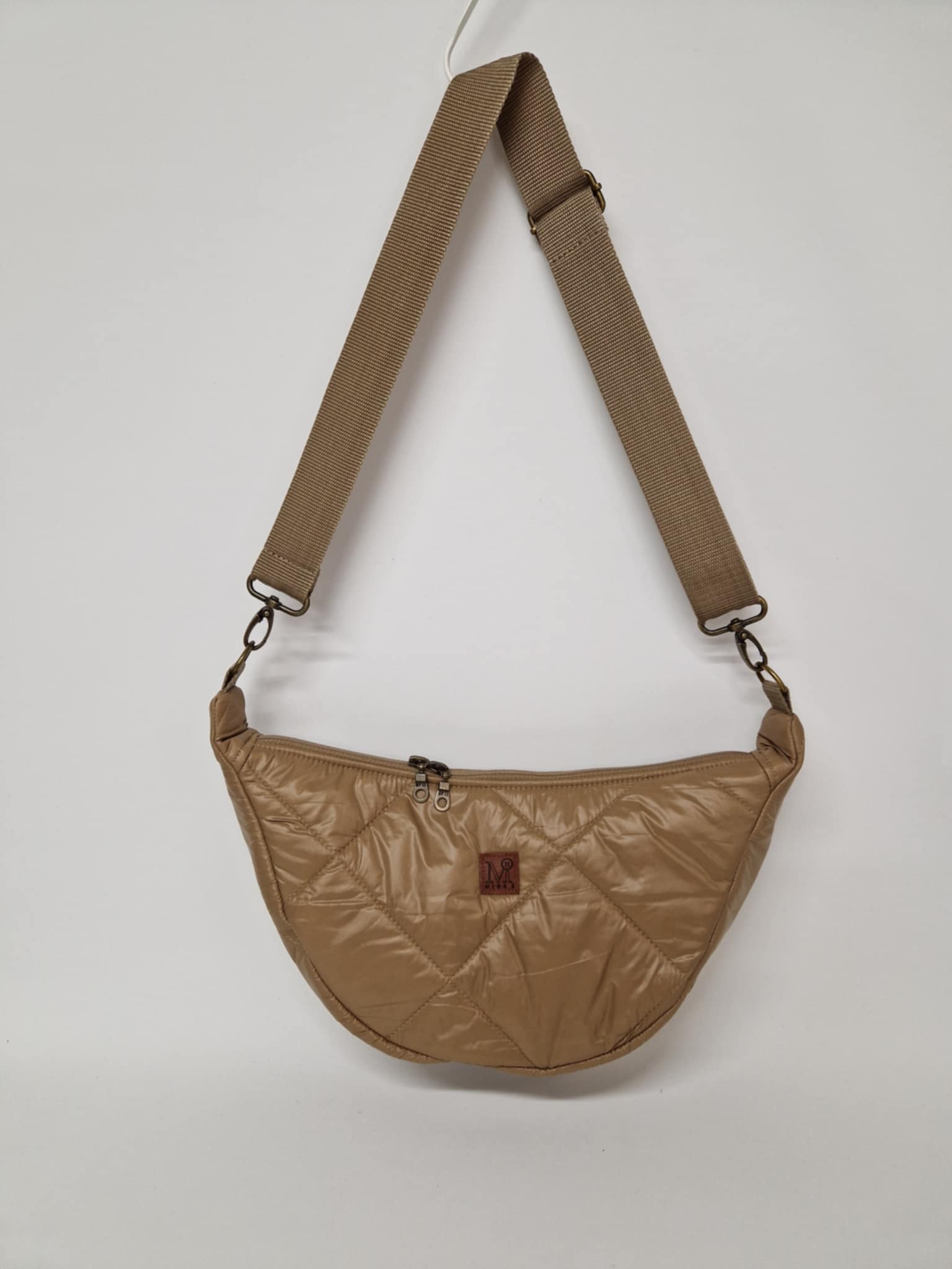 Üleõla/grossbody kott. Materjaliks beez tepitud kangas. Kotirihm kinnitatav metall karabiinidega ja on eemaldatav. Kott ei ole tugevalt vormi hoidev vaid pigem pehme. Koti sees 1 luku väike lisatasku ja 2 taskut.