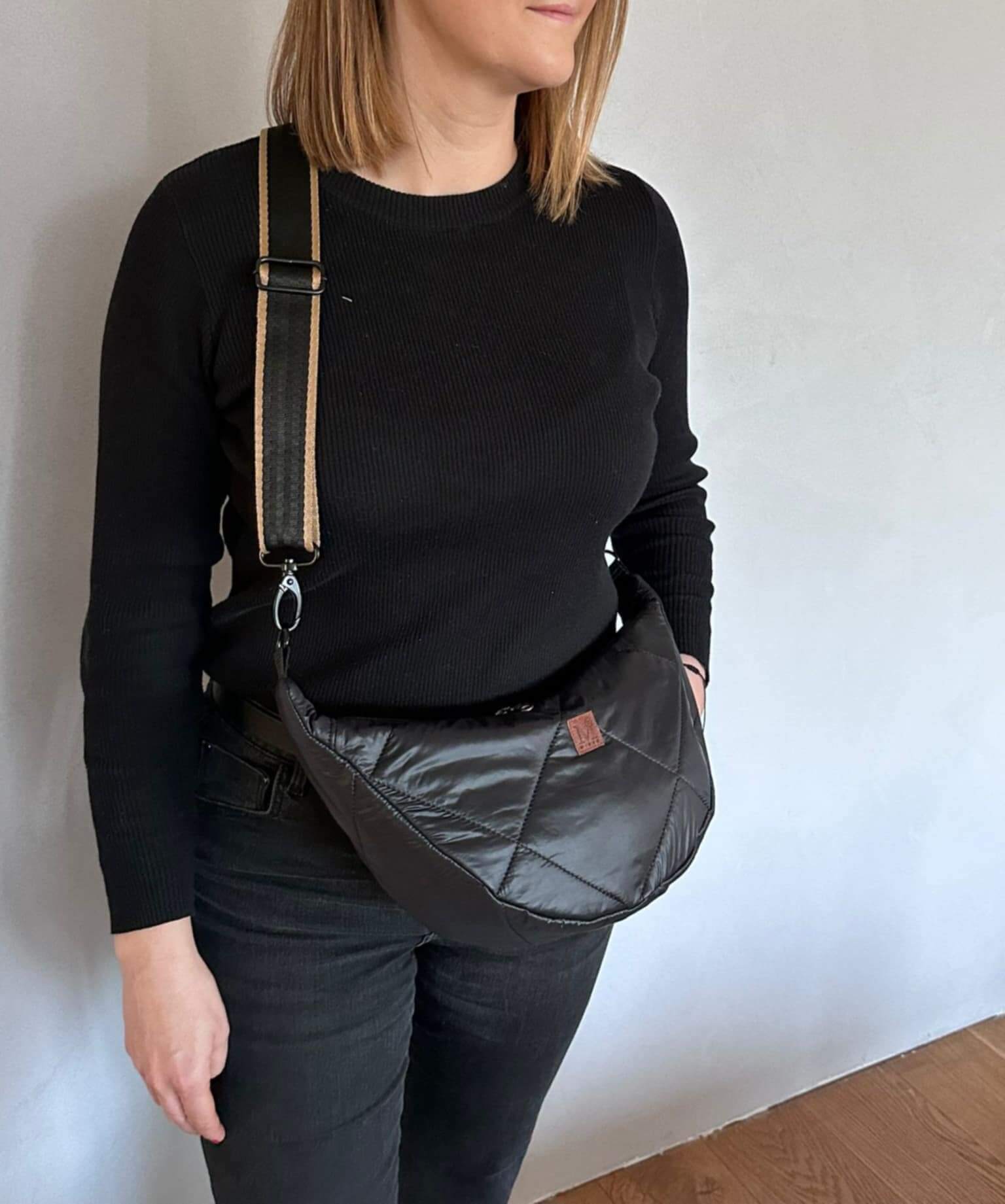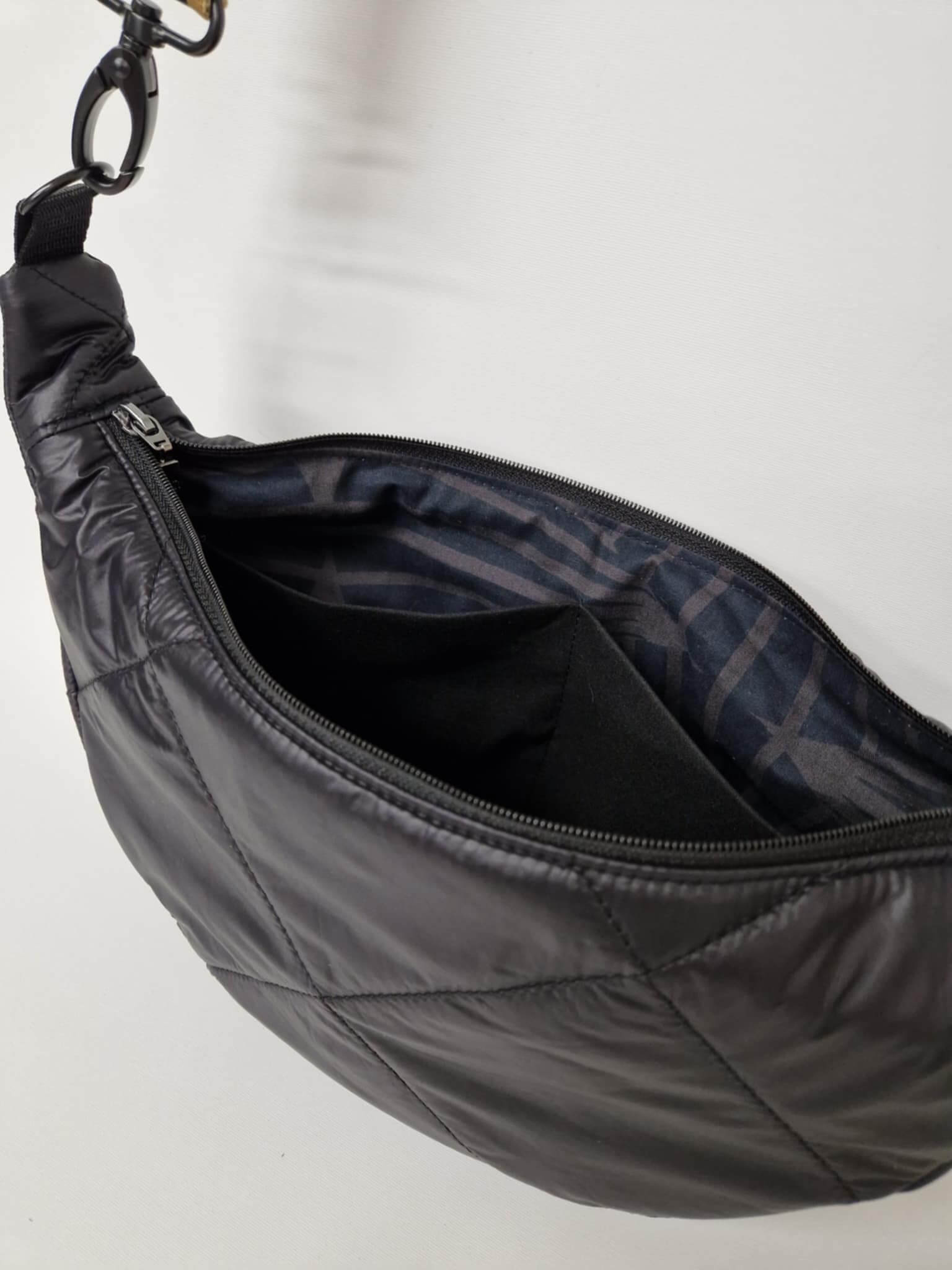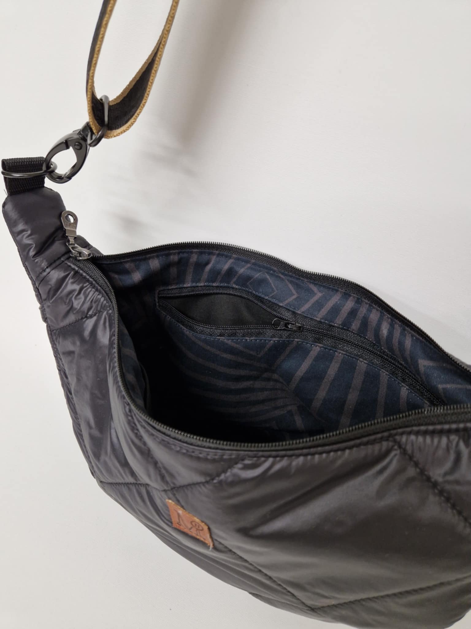 Üleõla/grossbody kott. Materjaliks must tepitud kangas. Kotirihm kinnitatav metall karabiinidega ja on eemaldatav. Kott ei ole tugevalt vormi hoidev vaid pigem pehme. Koti sees 1 luku väike lisatasku ja 2 taskut.